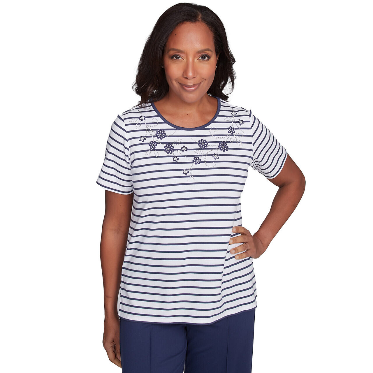 Elevate your casual wardrobe with this striped crewneck top, featuring a subtle blue trim and beaded floral accents on the neckline. With short sleeves and a straight hemline, it's the perfect blend of classic stripes and feminine detail, offering effortless style for any occasion.