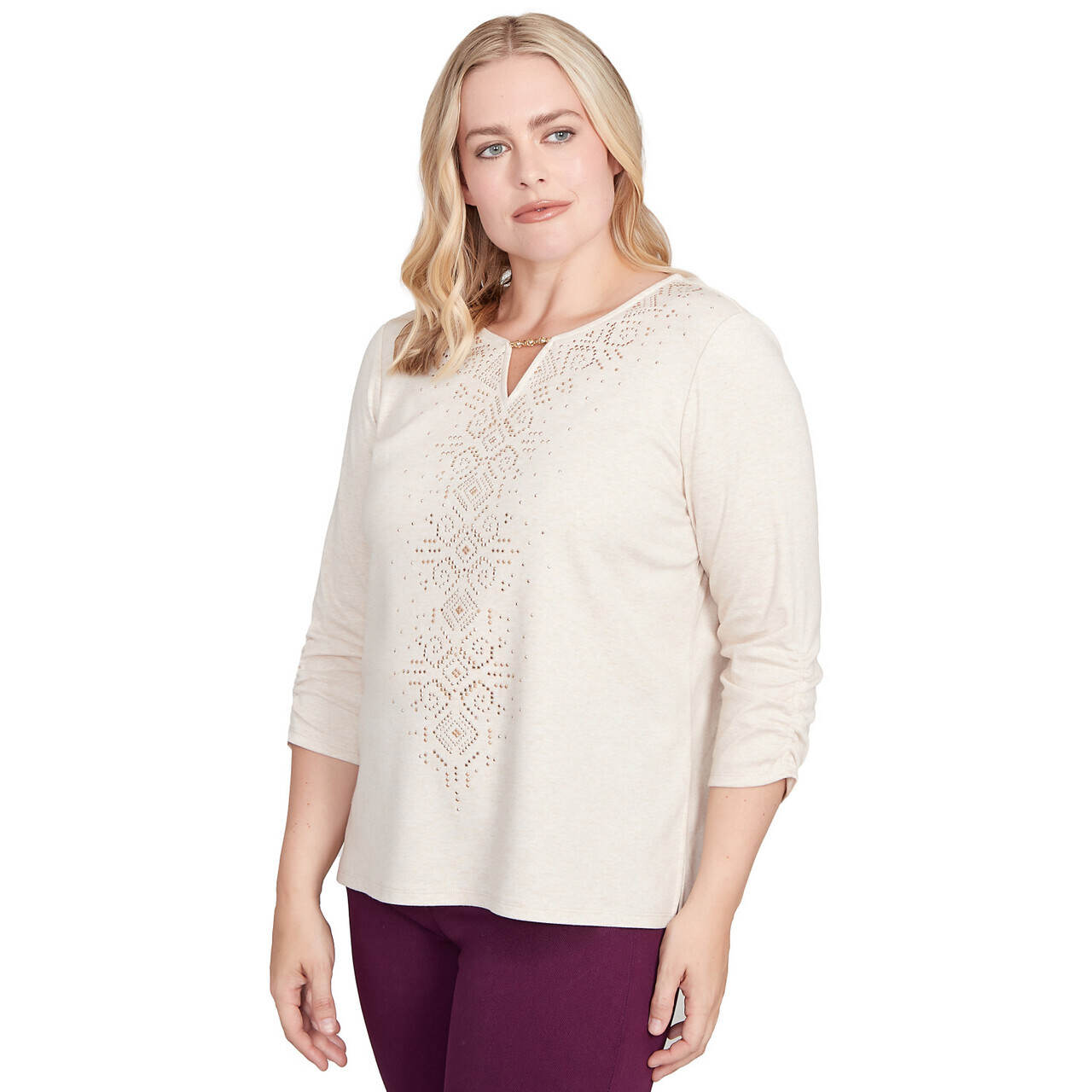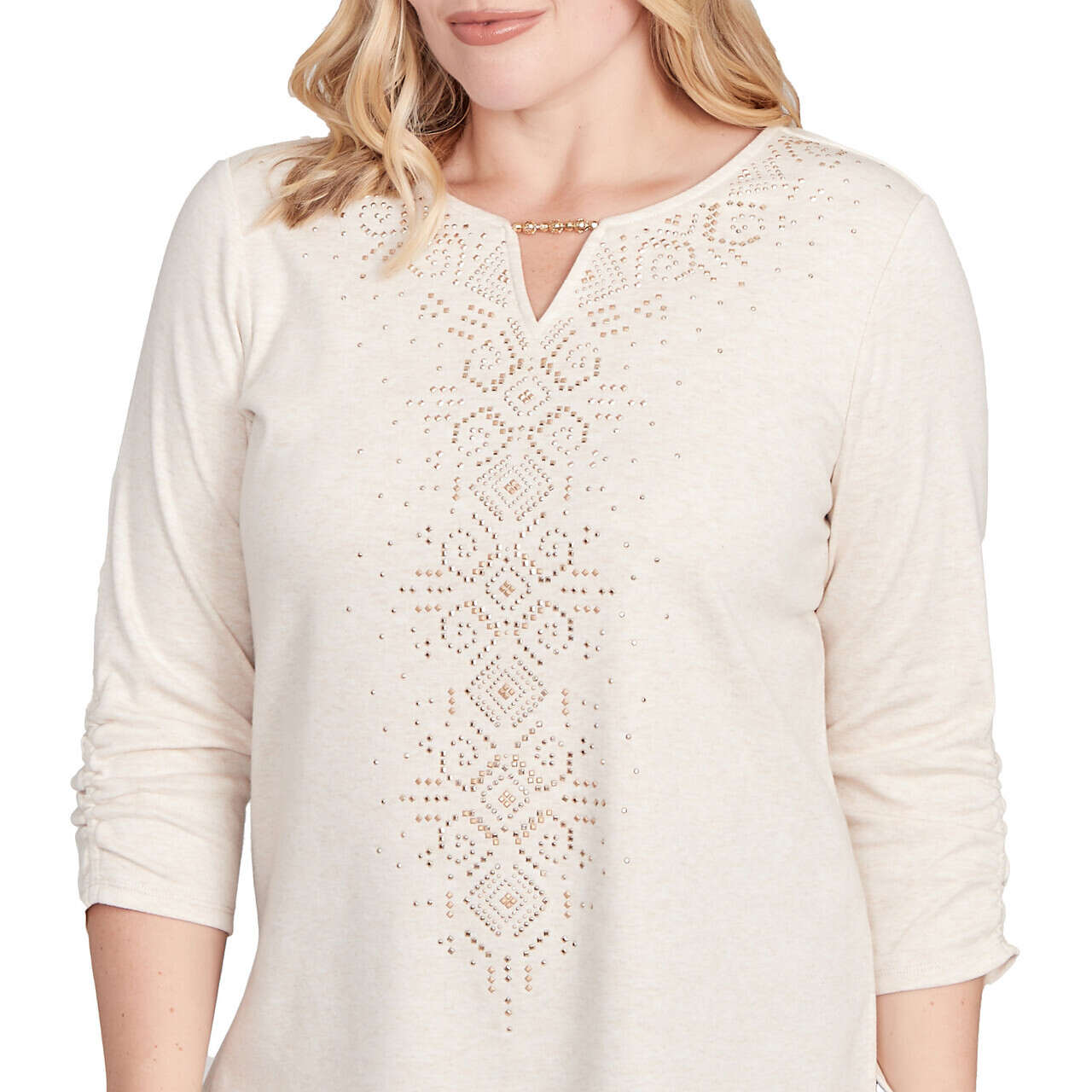 This effortlessly chic top features eye-catching heat set embellishments that draw the eye to the center. Designed with a flattering V-neckline, three-quarter flare sleeves, and a straight hem, it brings a touch of sparkle to your everyday style.