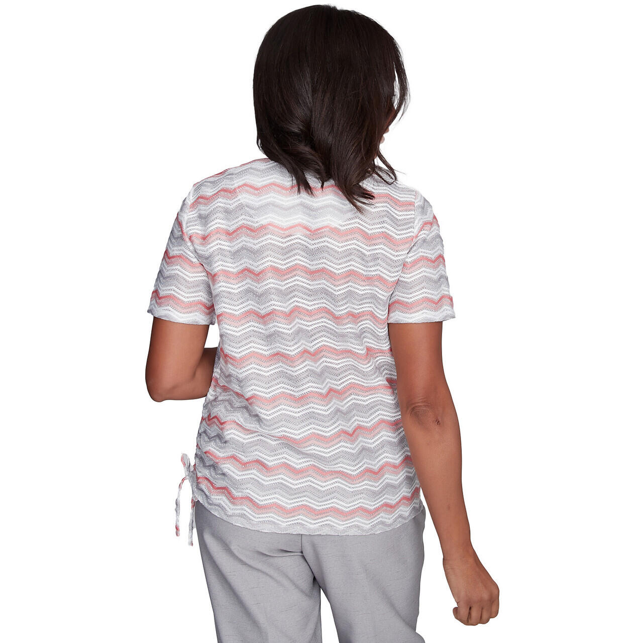 This shimmer chevron top features a flattering drawstring closure with ruching on one side, creating a chic, contoured fit. Adorned with a stylish necklace detail at the neckline, it also boasts a classic crew neck and short sleeves for a polished yet comfortable look. Perfect for adding a touch of shimmer to any outfit.