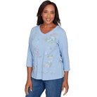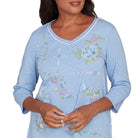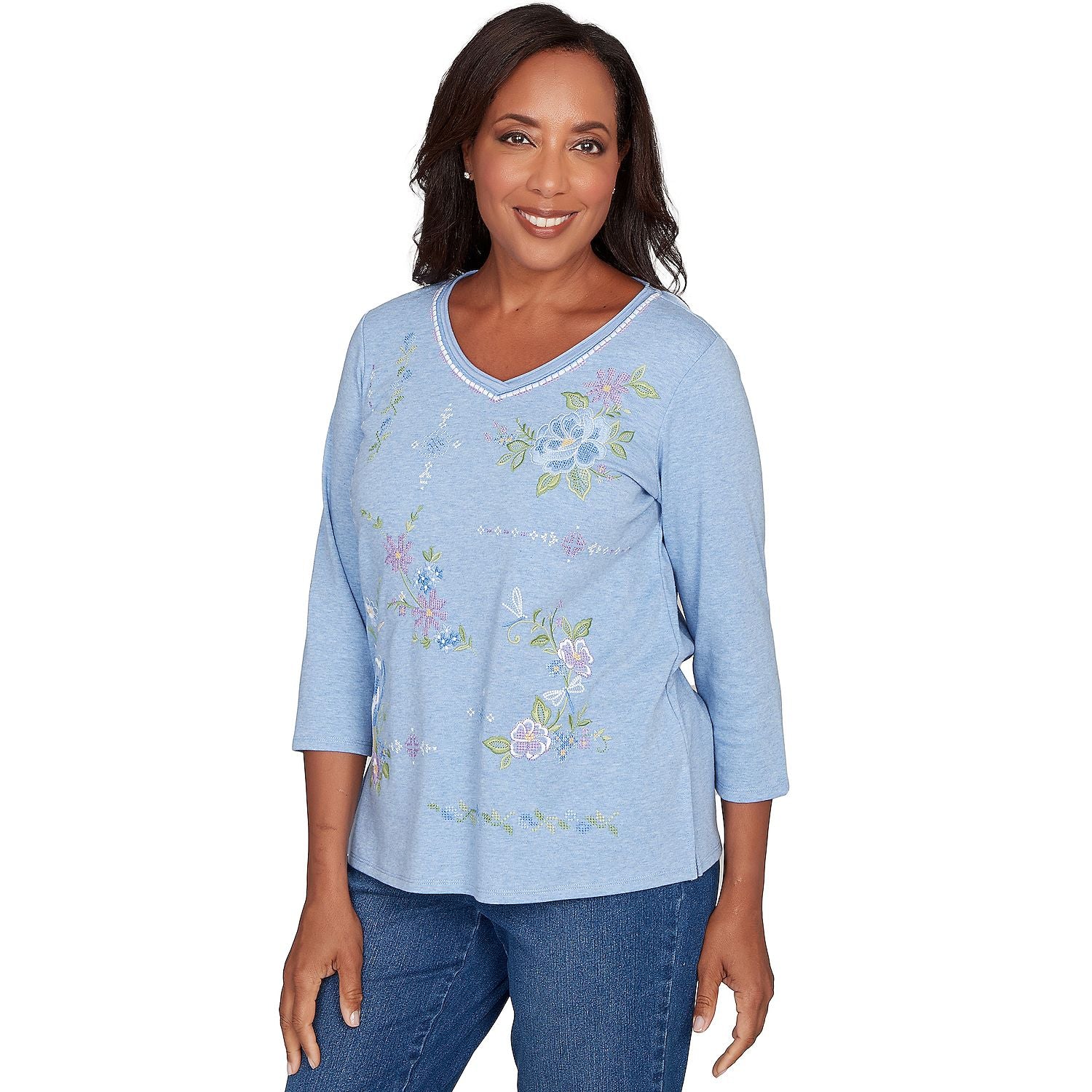 Add a dash of charm to your wardrobe with this delightful top featuring cross-stitched floral designs that radiate a unique handcrafted feel. With a modified V-neckline and three-quarter sleeves, this Alfred Dunner top is perfect for elevating your everyday look while keeping you effortlessly comfortable and stylish.