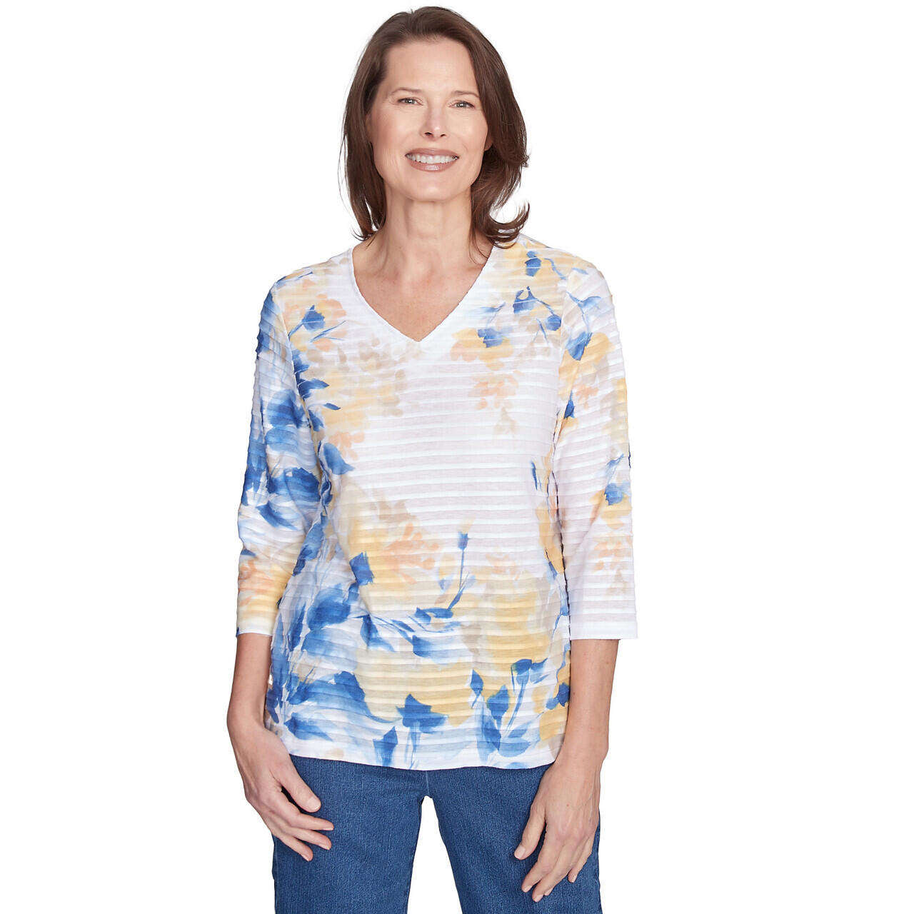 This top brings subtle elegance with its intricate V-neckline and delicate floral texture. With three-quarter sleeves and a clean straight hemline, it's a versatile piece that combines refined details with everyday ease, perfect for adding a soft, stylish touch to your look.