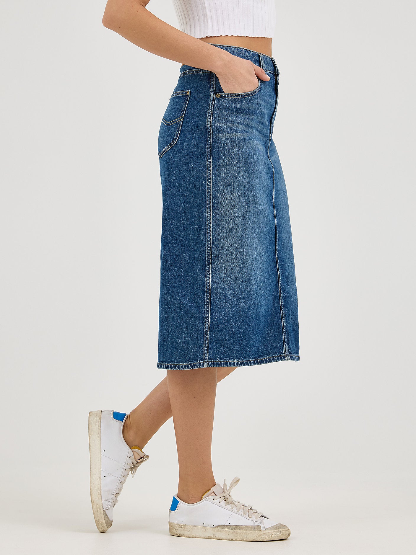Let’s put a spin on your old blue jeans. Influenced by the classic pencil skirt, this denim rendition comes with our signature five-pocket design and a slit in the back, all in a midi-style package. With reinforced stitching at the waist and down the seams, this sturdy skirt is designed to last.