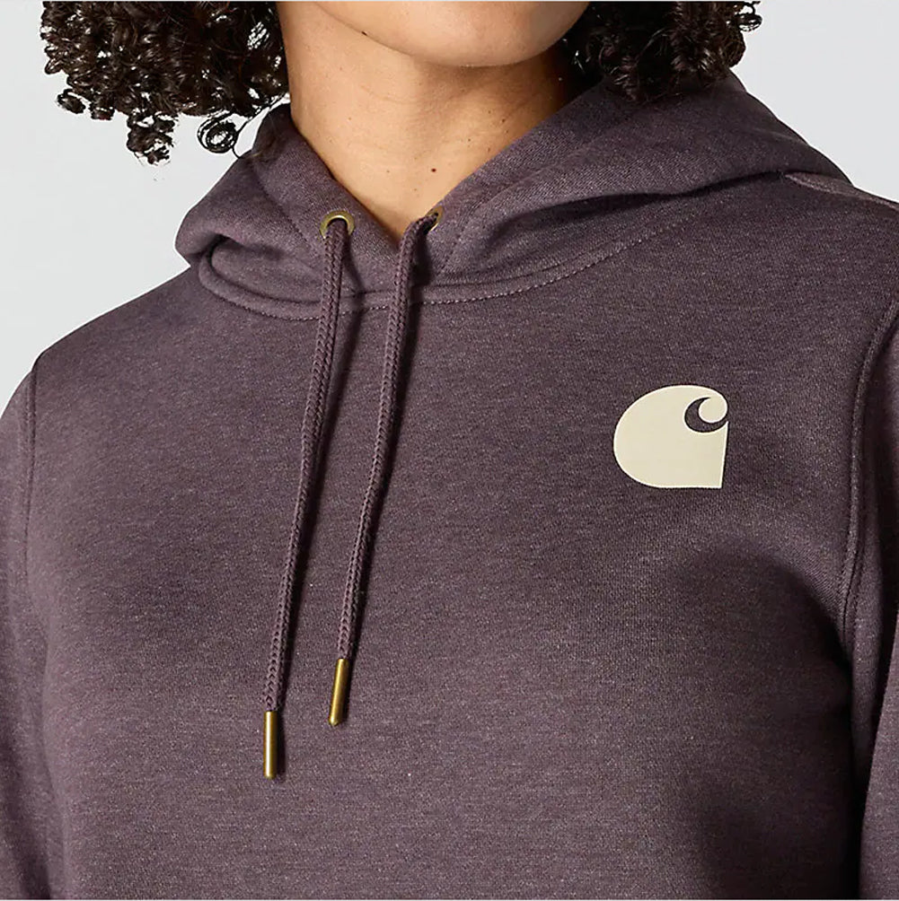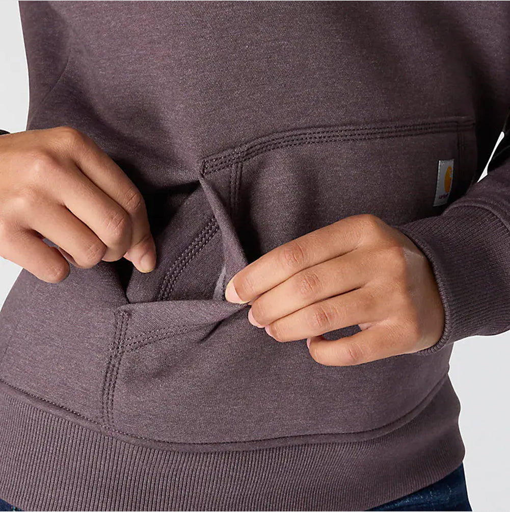 Cold winter mornings are a lot more comfortable with this women's cozy hoodie. Made of heavyweight fleece, the sweatshirt is brushed on the inside for extra softness. It has a relaxed fit that allows for easy layering, and it's finished with a Carhartt logo down the sleeve.