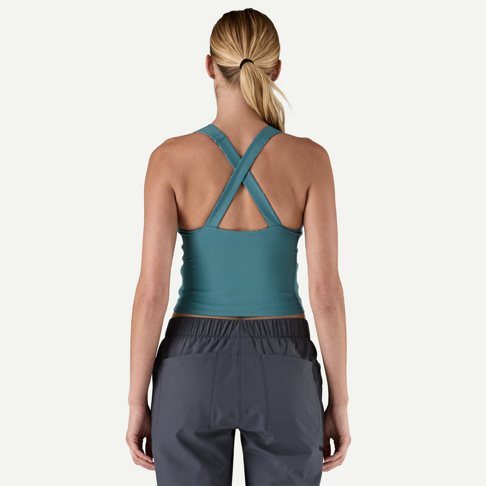 A high neckline, low-profile straps that lie flat across the shoulders, and low, contoured armholes won’t hold you back while you're reaching overhead or contorting on cryptic corner climbs