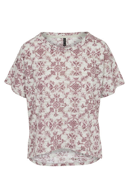 Floral pattern, pink and cream colors, relaxed fit, rounded neckline, suitable for casual wear.
