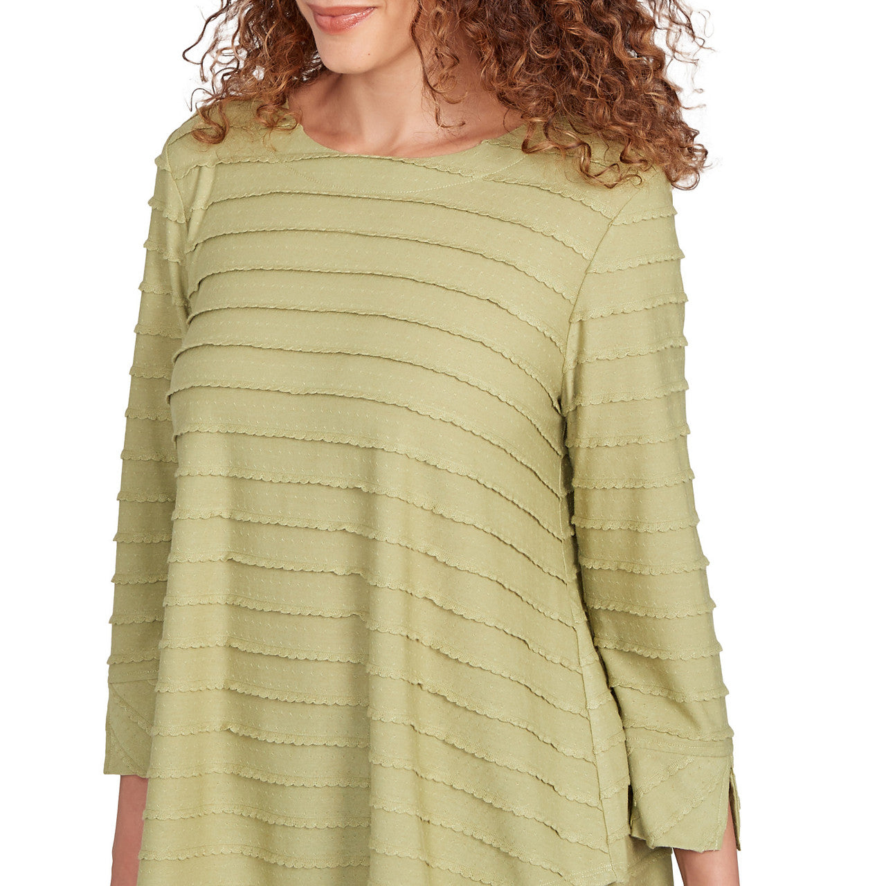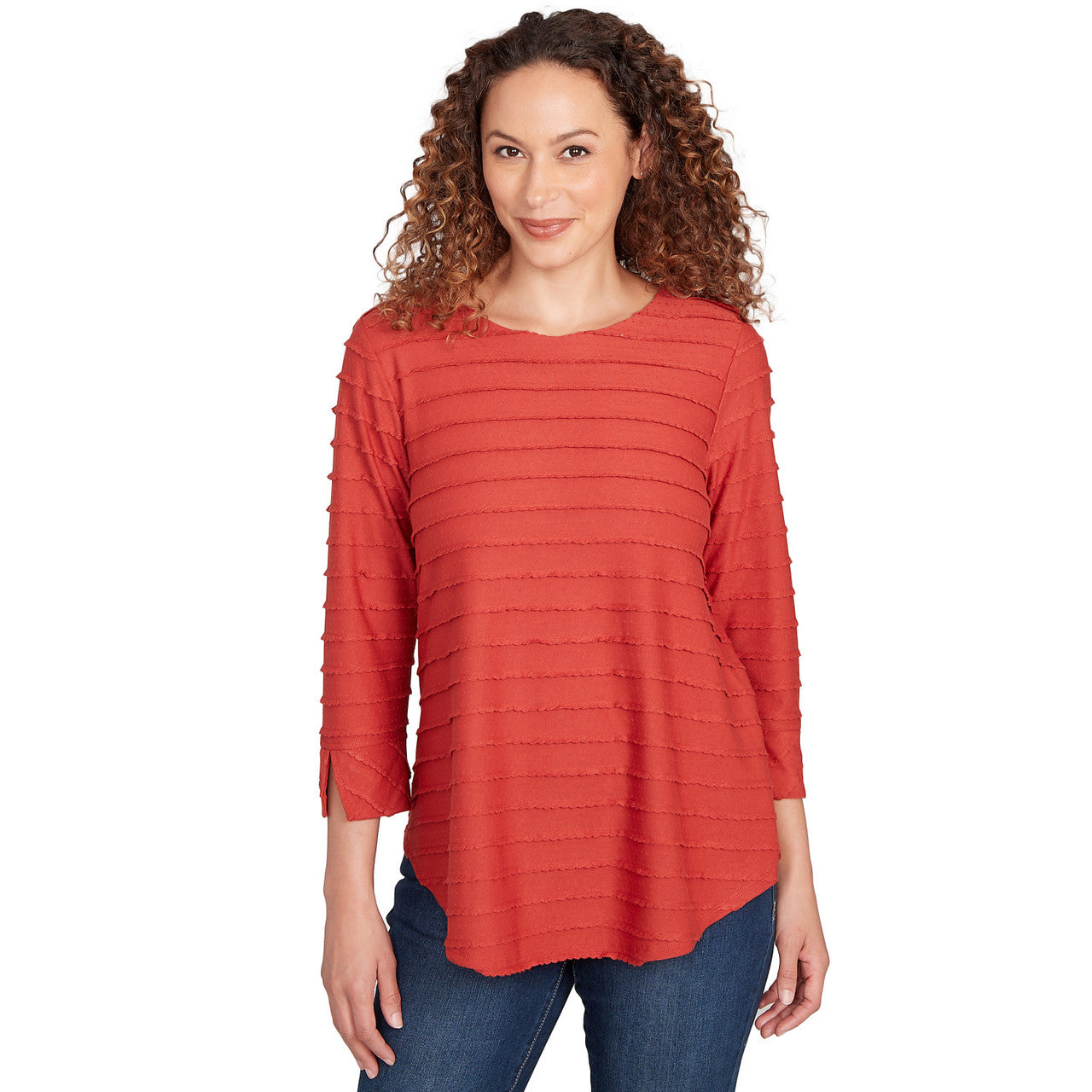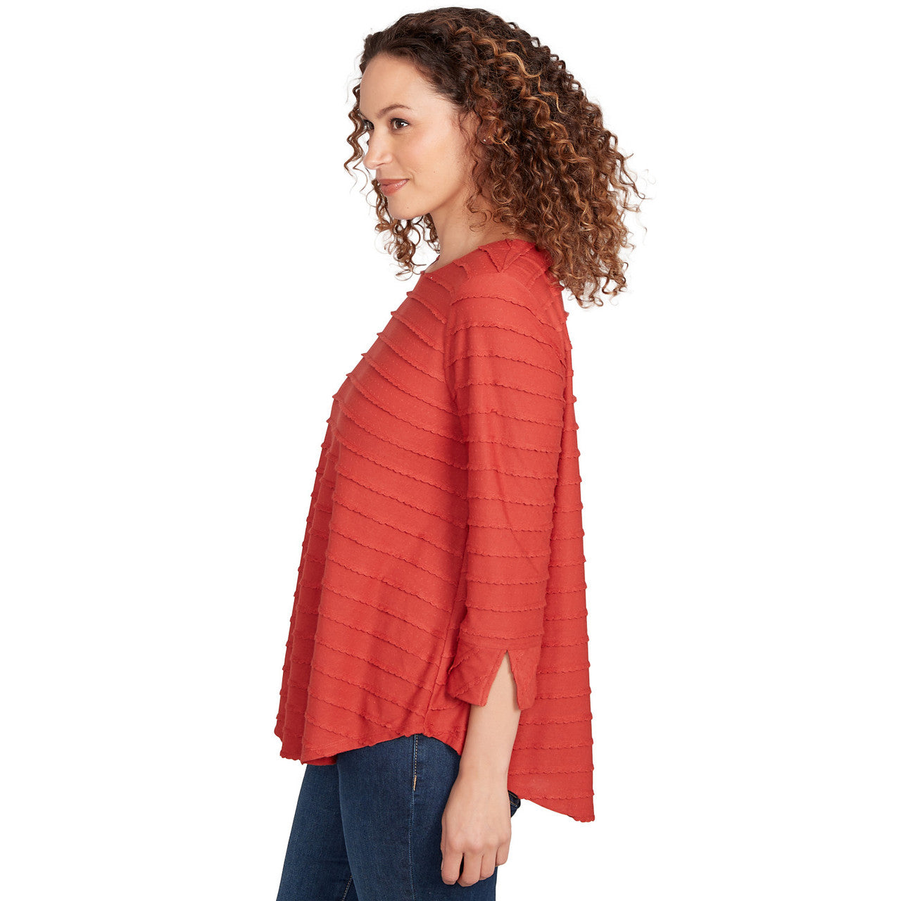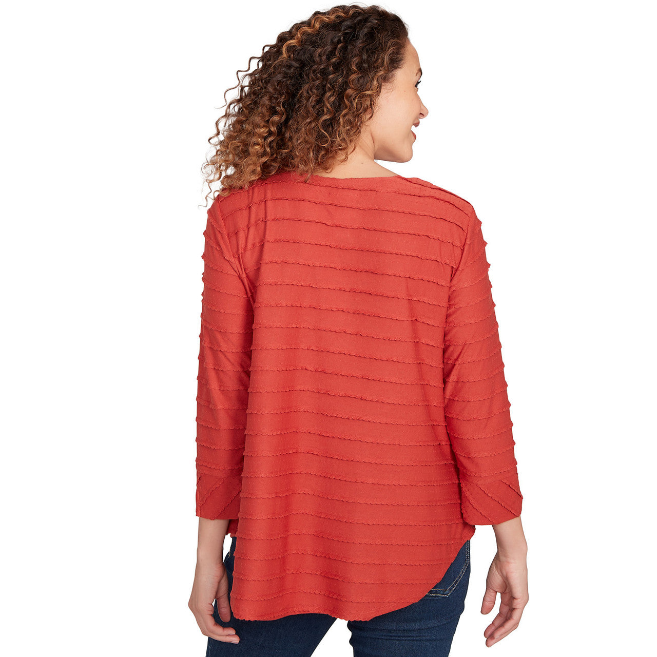 This soft solid knit top features a scalloped jacquard texture for an easy, elevated look. Finished with a flattering scoop neckline, 3/4 sleeves with subtle slits, and a rounded hem, it's a versatile piece that moves comfortably from day to night.