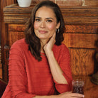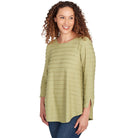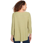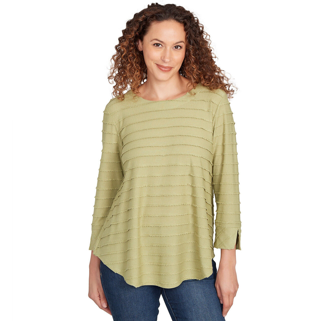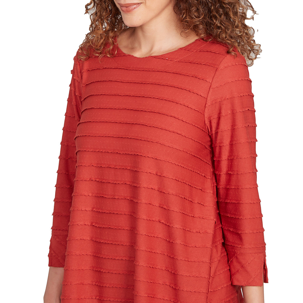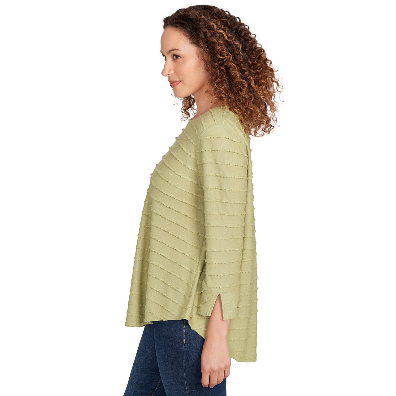 This soft solid knit top features a scalloped jacquard texture for an easy, elevated look. Finished with a flattering scoop neckline, 3/4 sleeves with subtle slits, and a rounded hem, it's a versatile piece that moves comfortably from day to night.