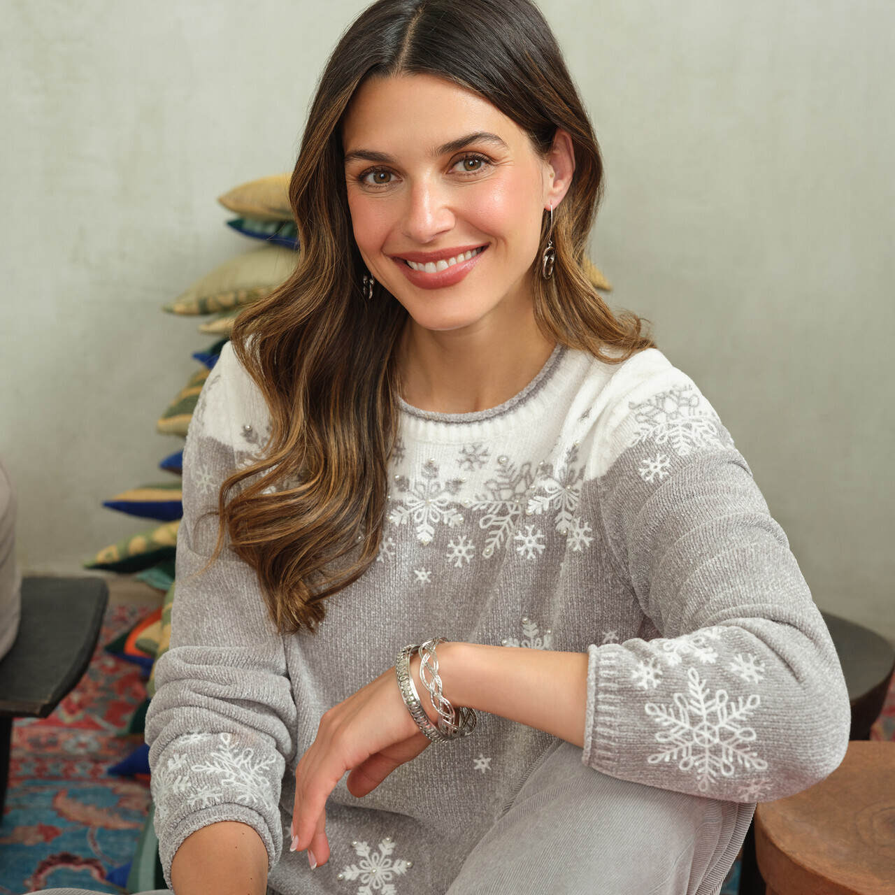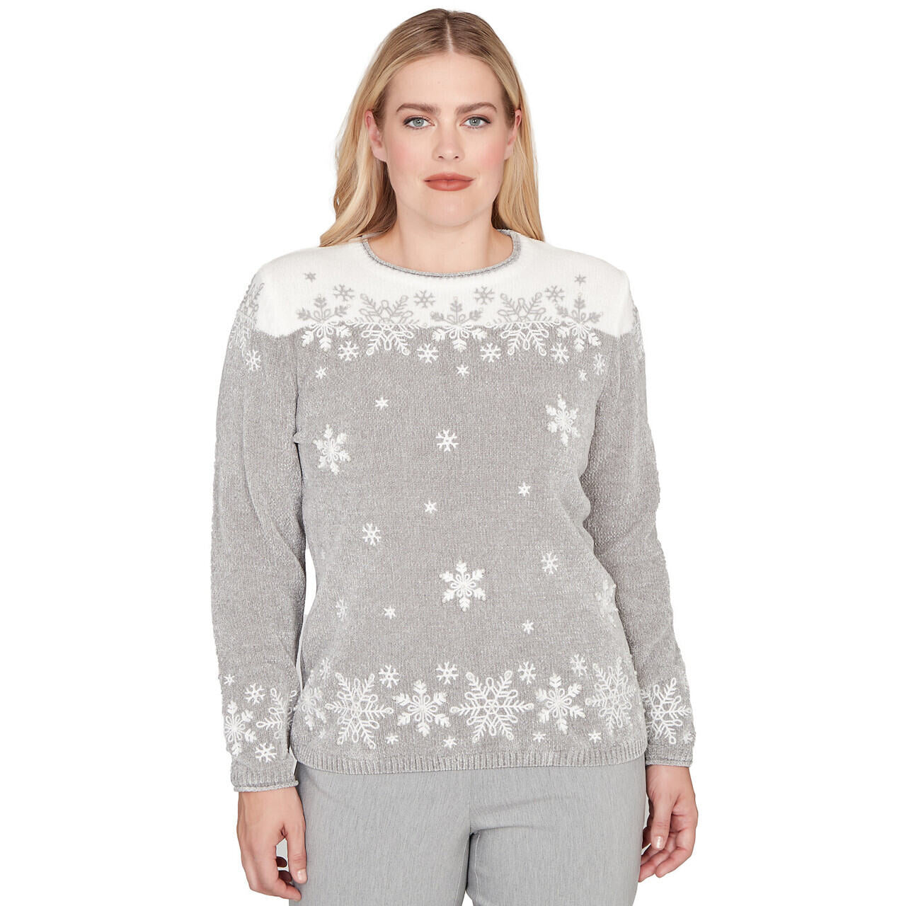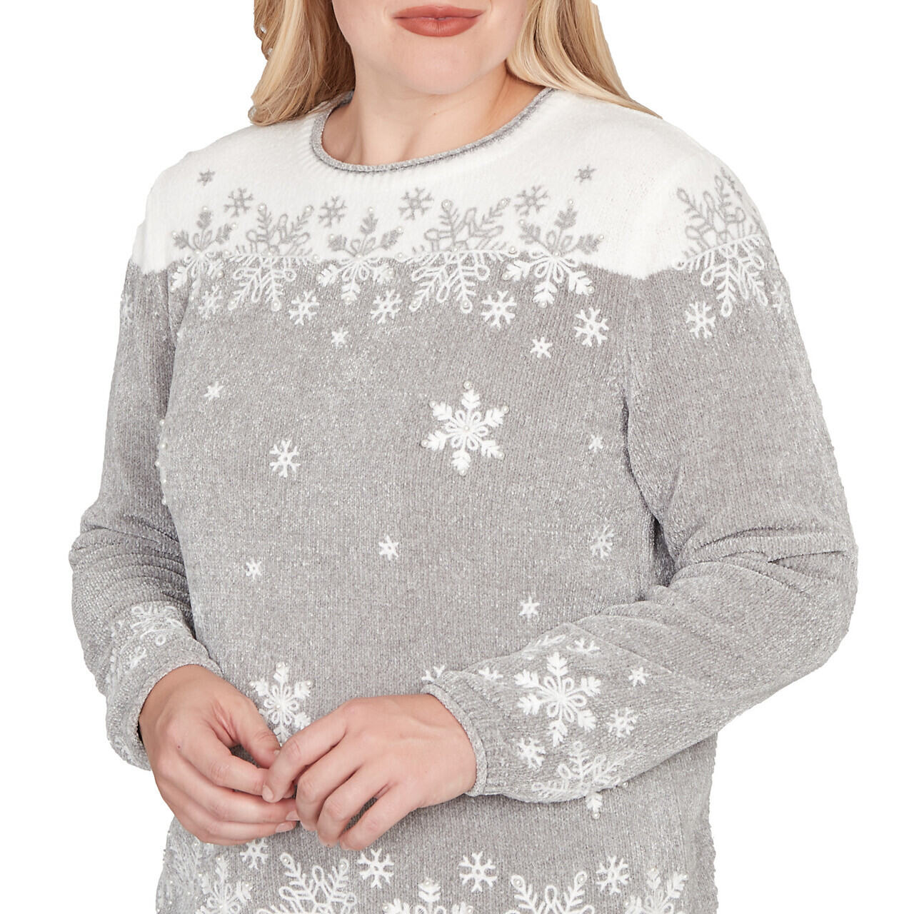 Snowflake embroidery twinkles with delicate pearls on this plush chenille top, adding a festive sparkle to your seasonal wardrobe. Designed with a crew neckline, long sleeves, and a soft straight hem, it wraps you in cozy comfort and holiday charm.