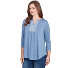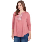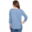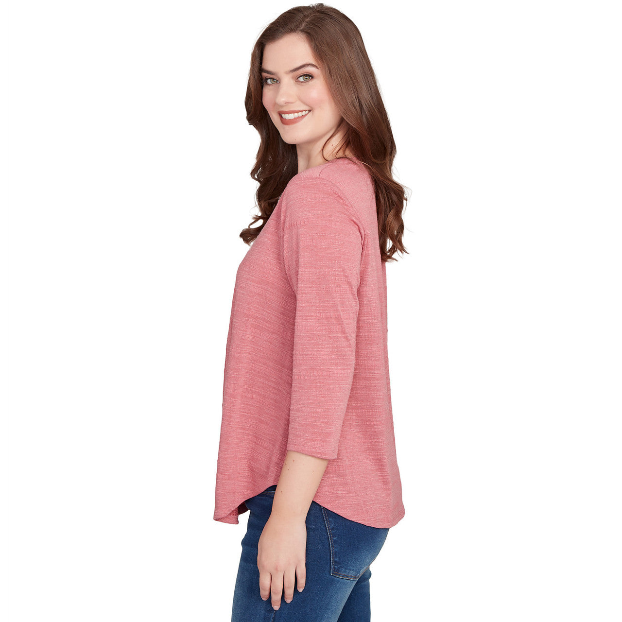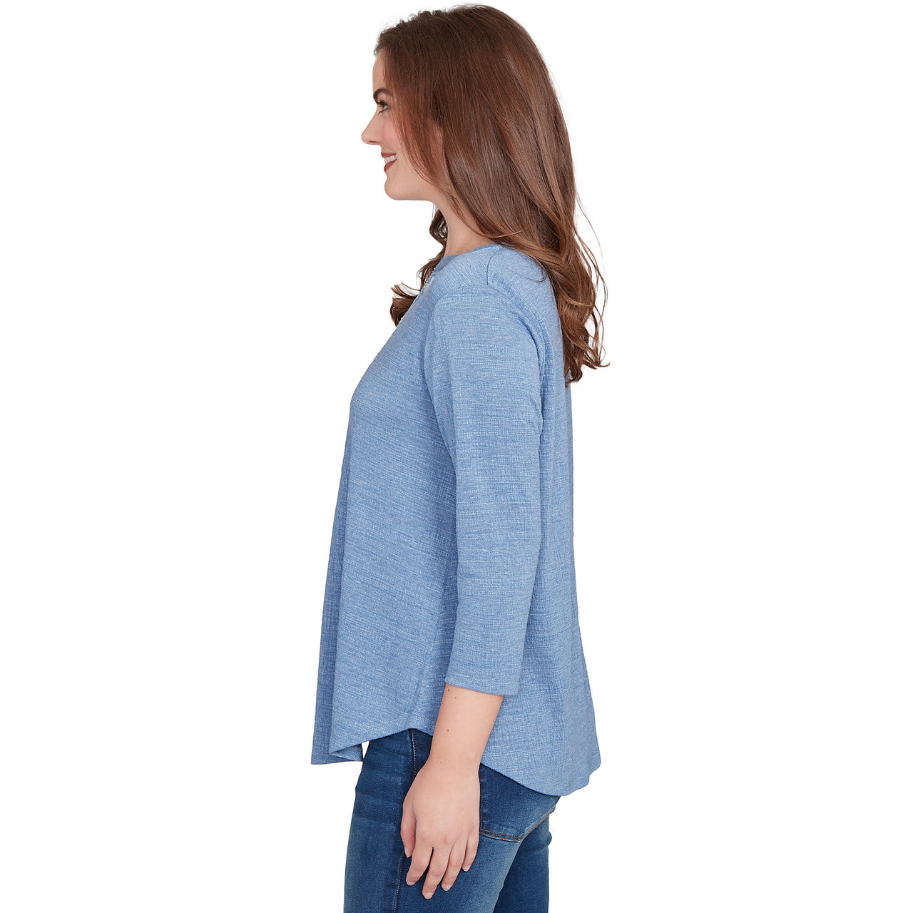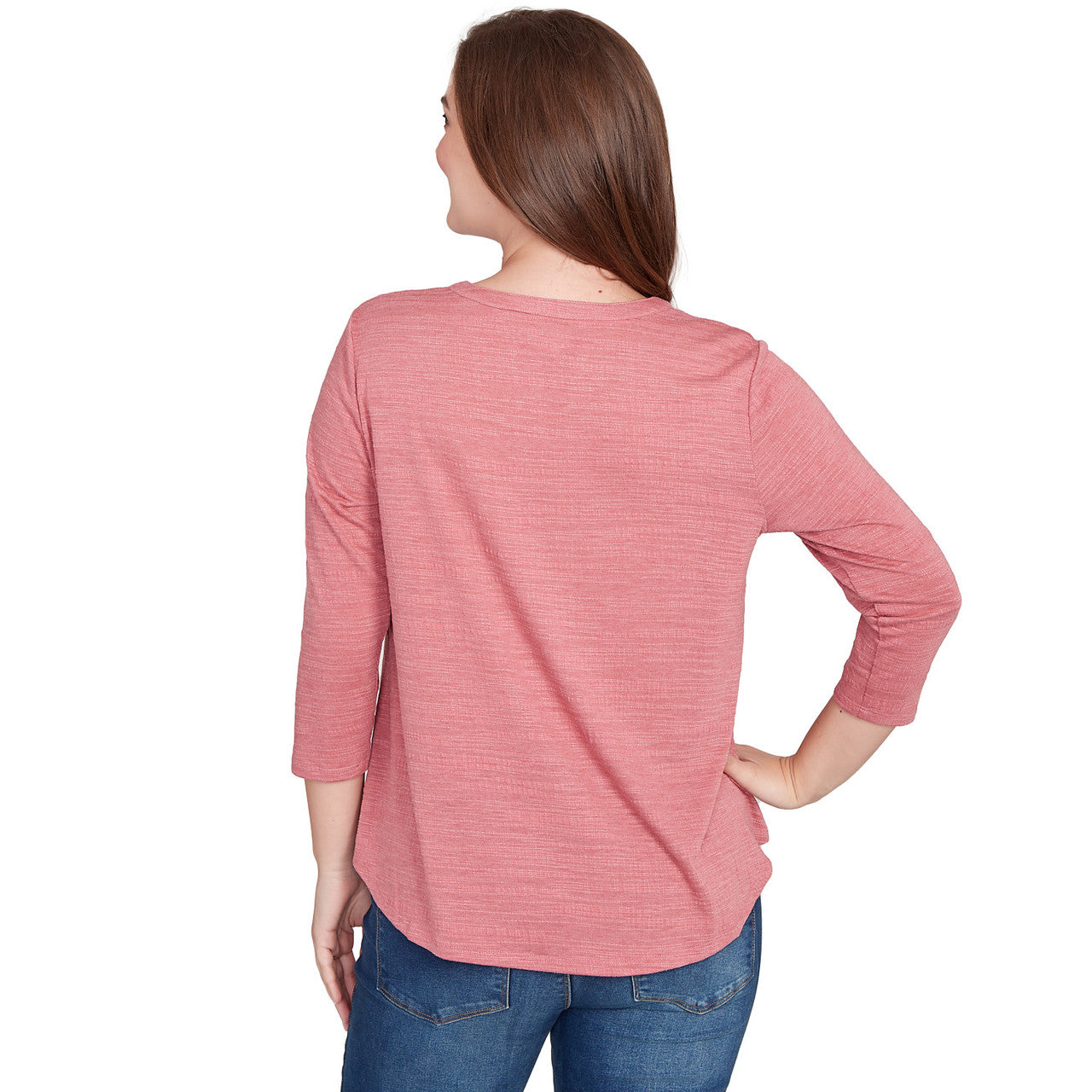 This top is crafted from a cozy solid heather textural knit that's comfortable and adds subtle visual interest. It features 3/4 length sleeves and the neckline is beautifully adorned with intricate stitch details and unique shell beading, giving it an artisan touch. With a flattering V-neck and comfortable fit, it's an easy way to add a little something special to your casual style.