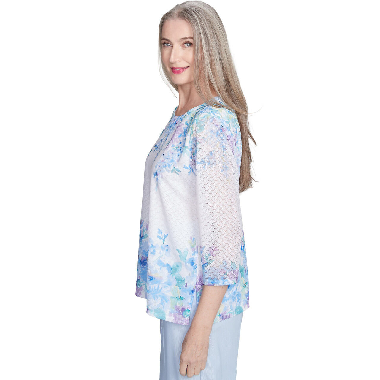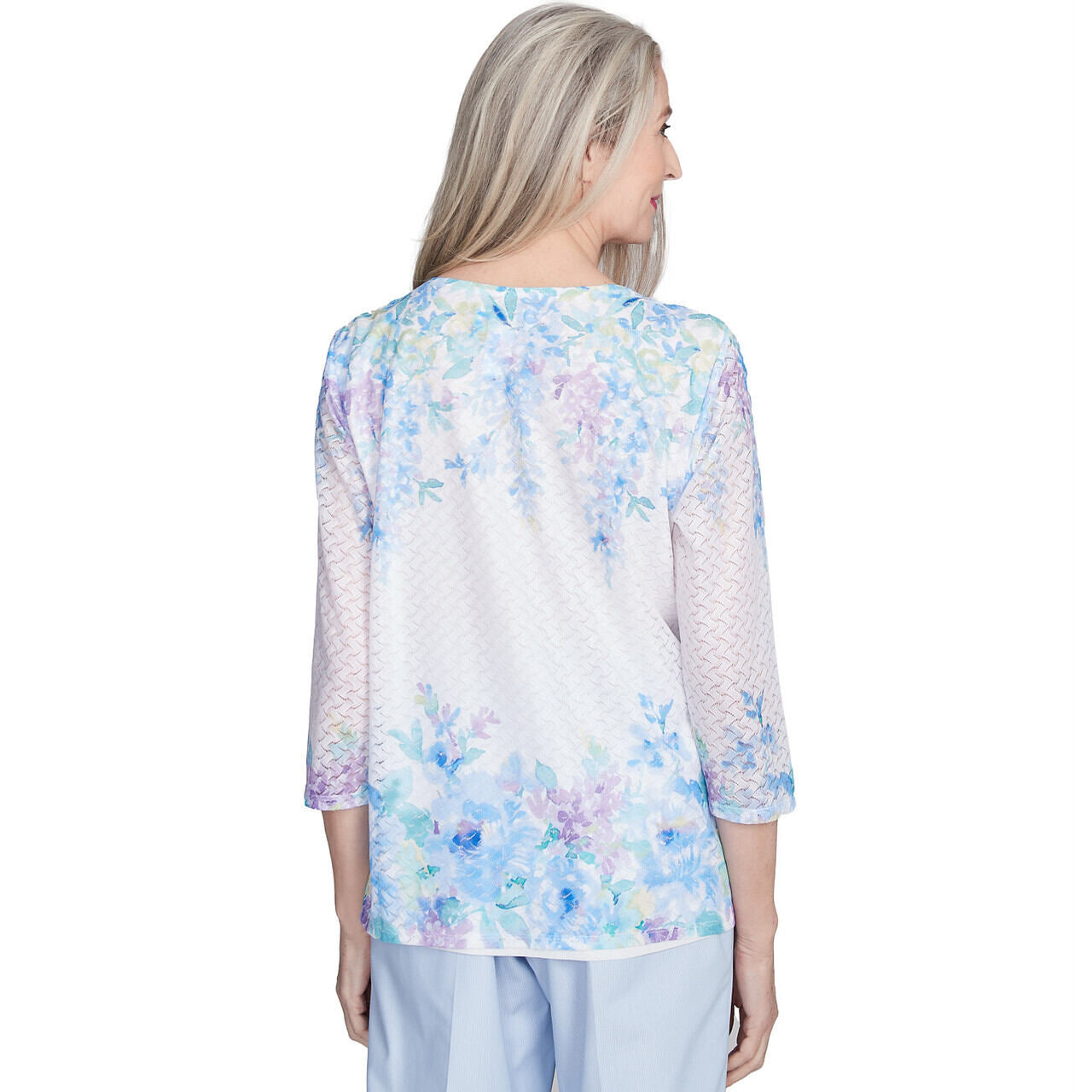This floral neckline and border top offers a fresh, feminine touch with its beautiful floral accents at the neckline and hem. The classic crew neckline and three-quarter sleeves provide a comfortable, flattering fit, while the split vents at the sides ensure a light, breathable feel.