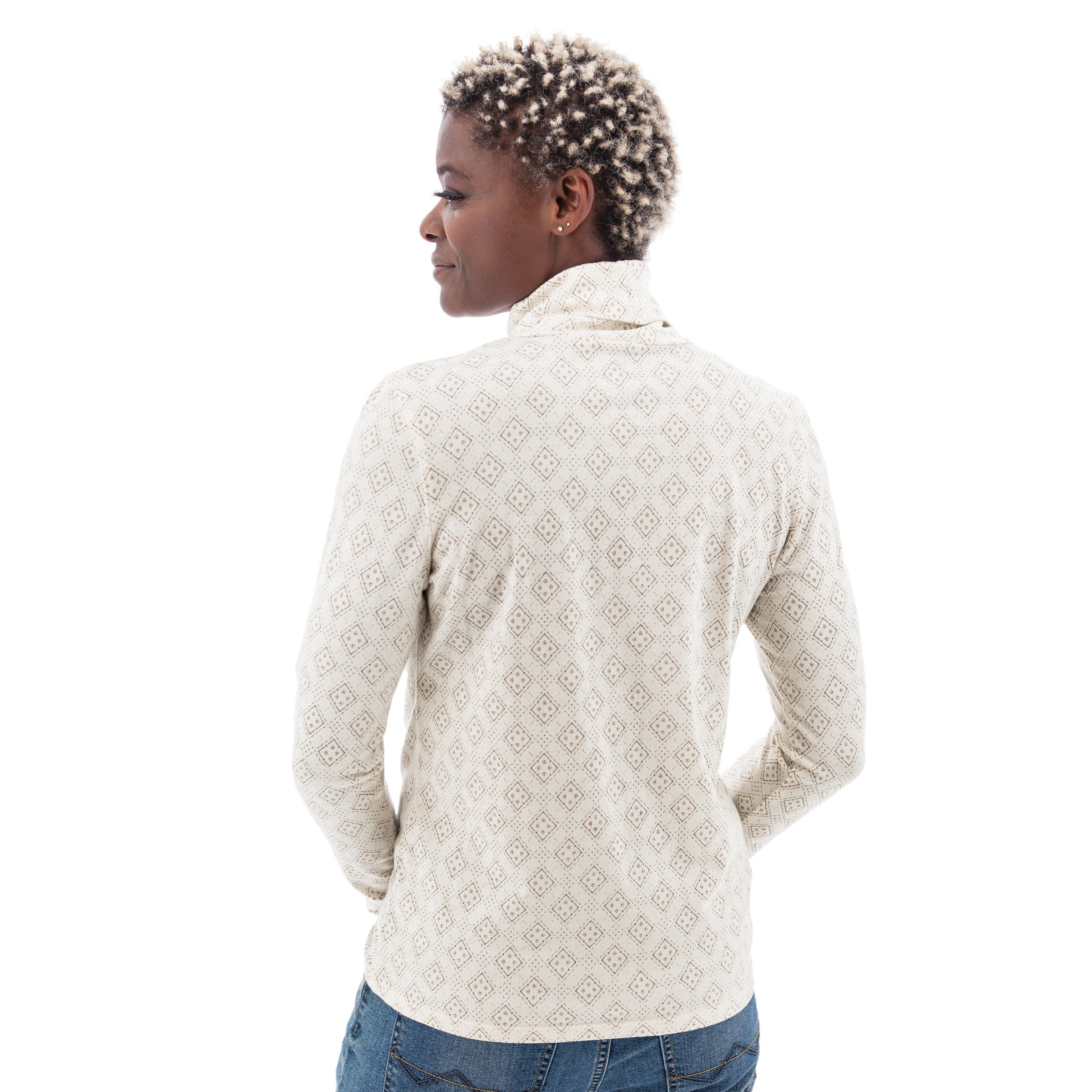 Ever wish your favorite turtleneck had just a little more charm? Good news-it can! Meet the Mariela Organic Geo Print Turtleneck, a.k.a. your new layering essential. Made in a Fair Trade Certified™ factory, this top blends thoughtful craftsmanship with practical comfort that works for any season. The organic cotton is buttery soft and feels like an old favorite from day one, while the subtle geo print adds just the right amount of personality without being over the top. No matter what adventure you have planned for the day, this top has you covered-literally.