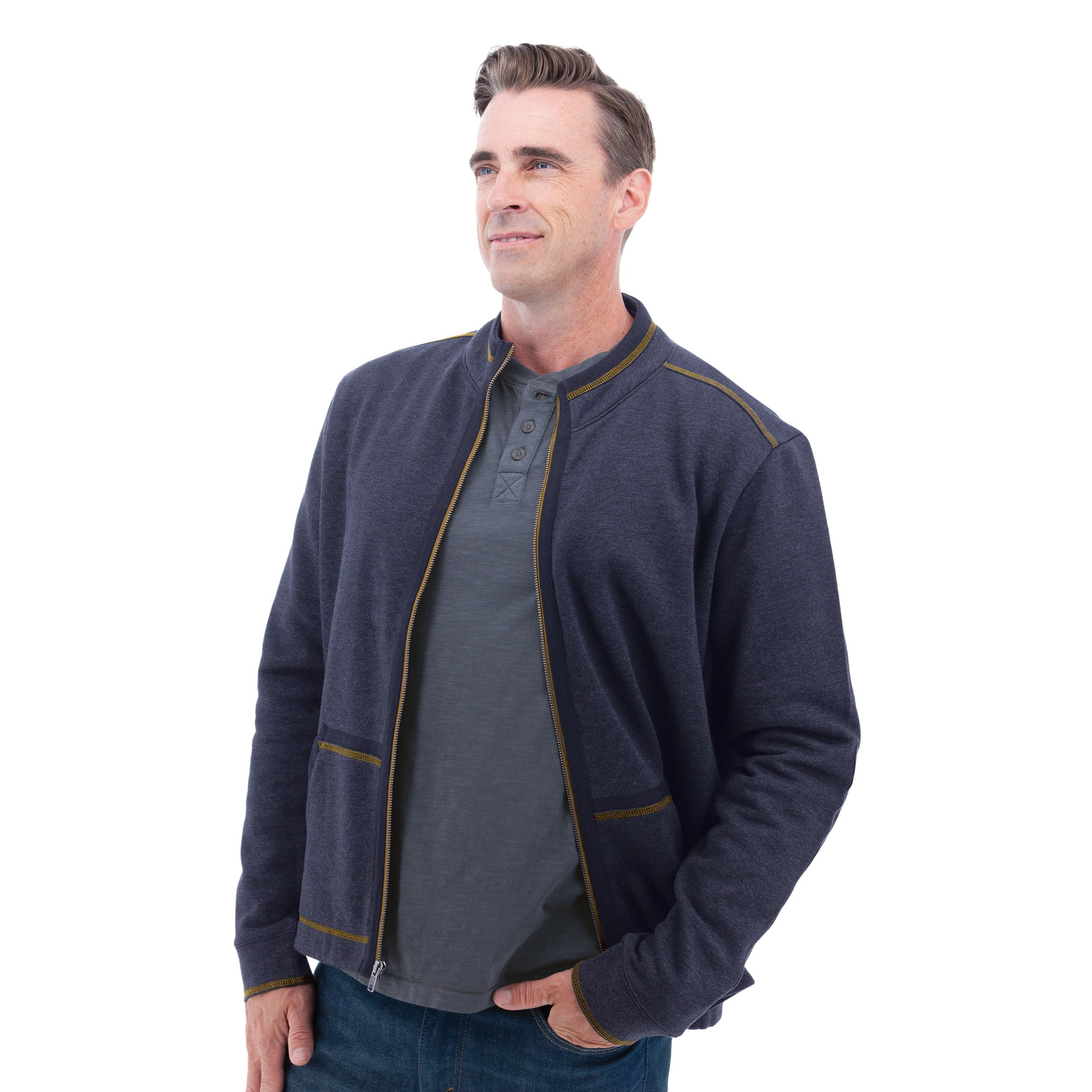 Warm, durable, and easy to throw on when the temps drop - we built the Waylen Jacket to be a versatile mid-layer. Made from a soft organic cotton blend, it has a heathered jersey exterior for a clean, classic look and a brushed fleece interior for extra comfort. We added woven trim at the zipper placket, pockets, collar edge, and elbow patches for extra durability where you need it most. Contrast stitching along the shoulders and hem gives it a little extra character, while the metal zipper with contrast tape keeps things classic.