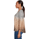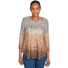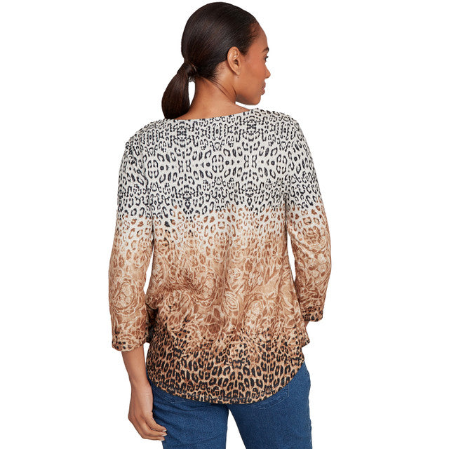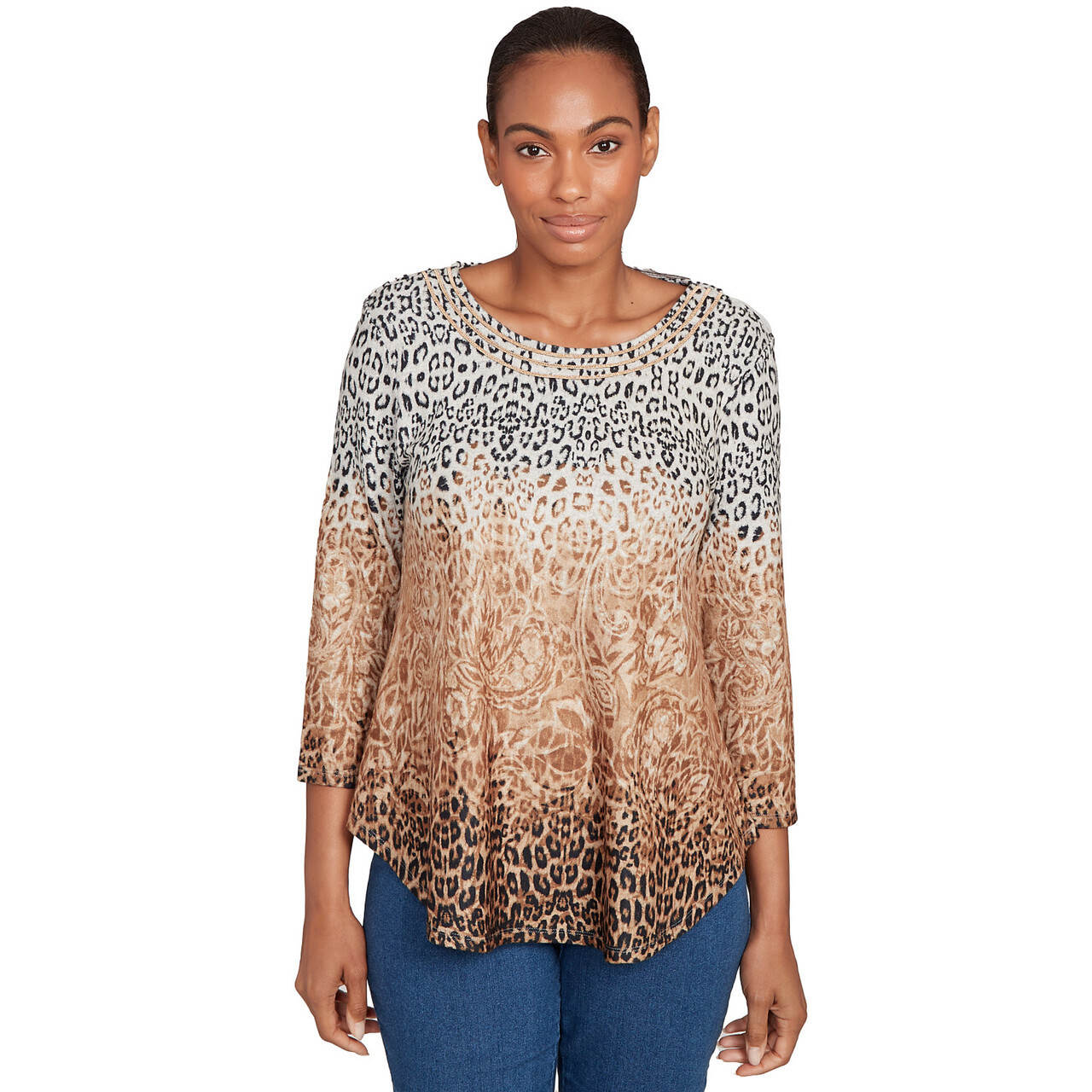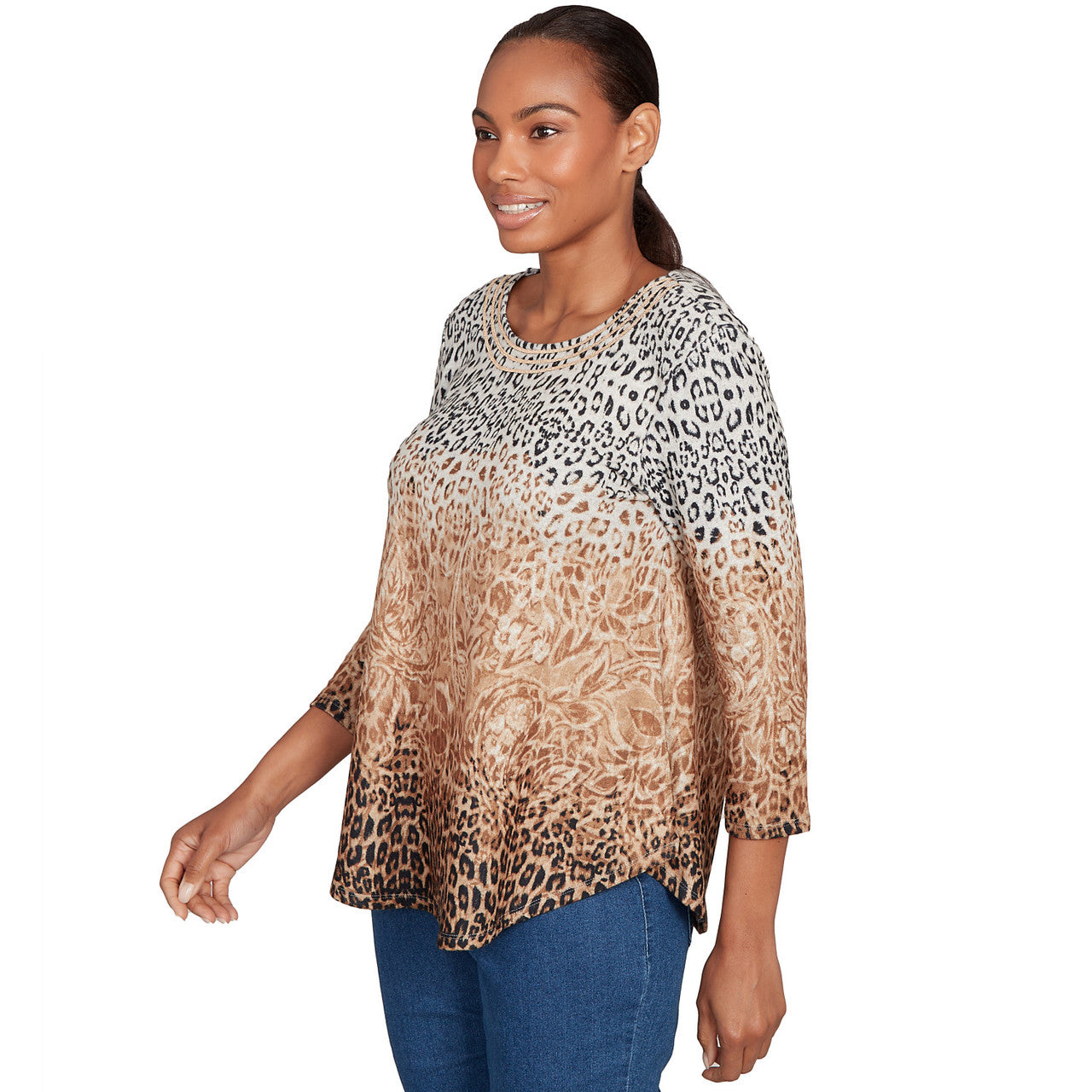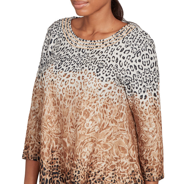 Wild at heart, polished at the neckline. This animal print top blends fierce pattern play with feminine details, featuring a tonal ombre design and sparkling caviar bead embellishments along the neckline. The soft silhouette and 3/4 sleeves keep it comfy, while the angled hem adds a modern finish. Perfect for dressing up your everyday.