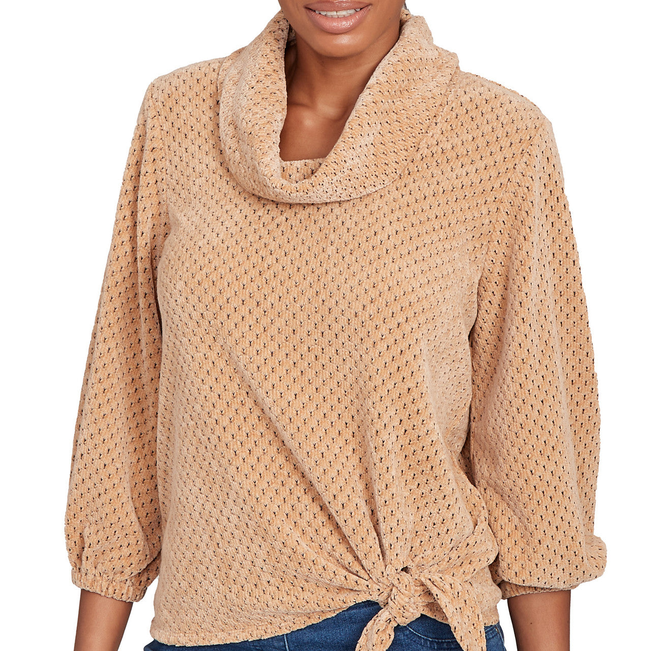Made from ultra-cozy honeycomb chenille, this top turns heads with its oversized cowl neck, soft puff sleeves, and a flattering front tie detail. Stretchy, stylish, and easy to wear-this one's a wardrobe win.