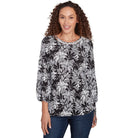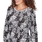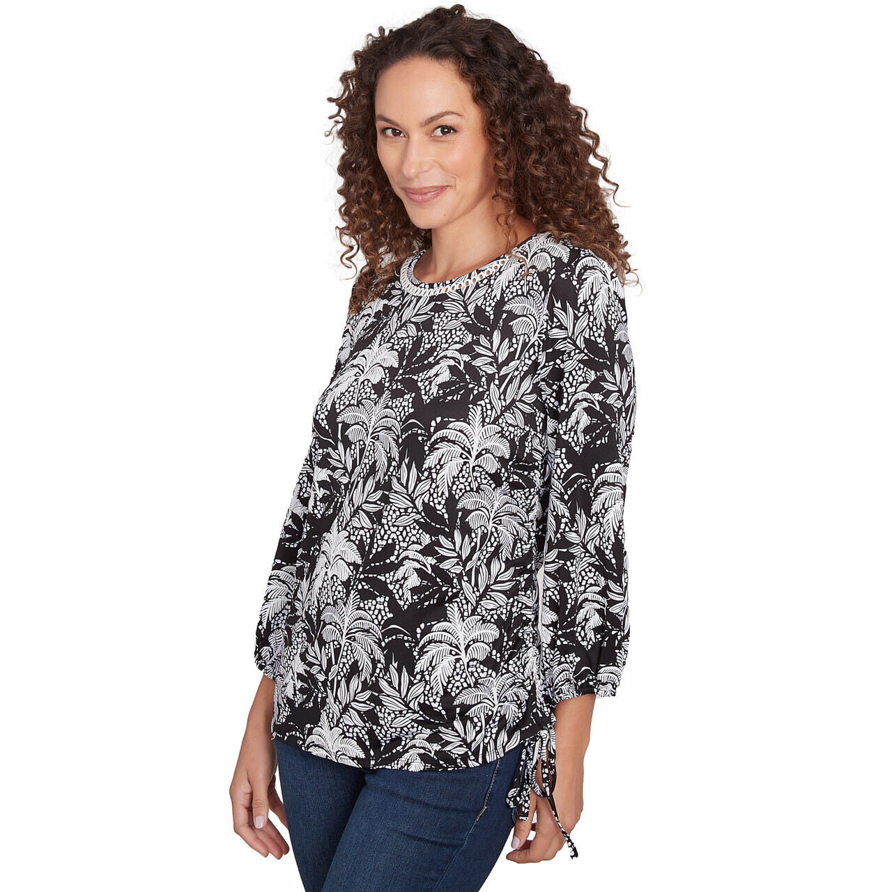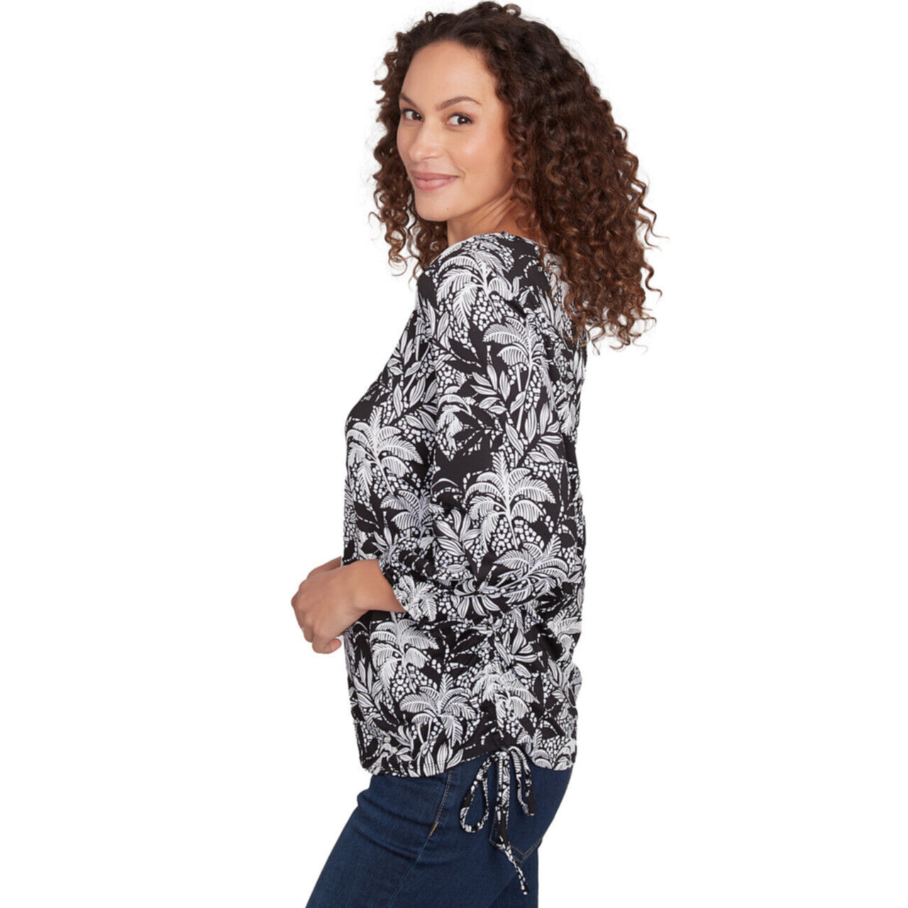 This ultra-flattering top features a unique monotone palm print embellished with puff print texture. Side ruching and puffed sleeves create a stylish silhouette, while the inset detail around the neckline adds a beautiful finish.