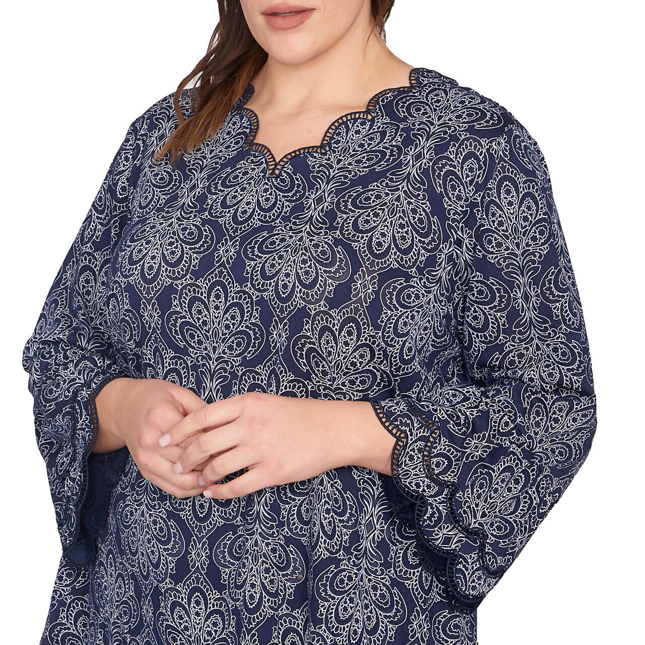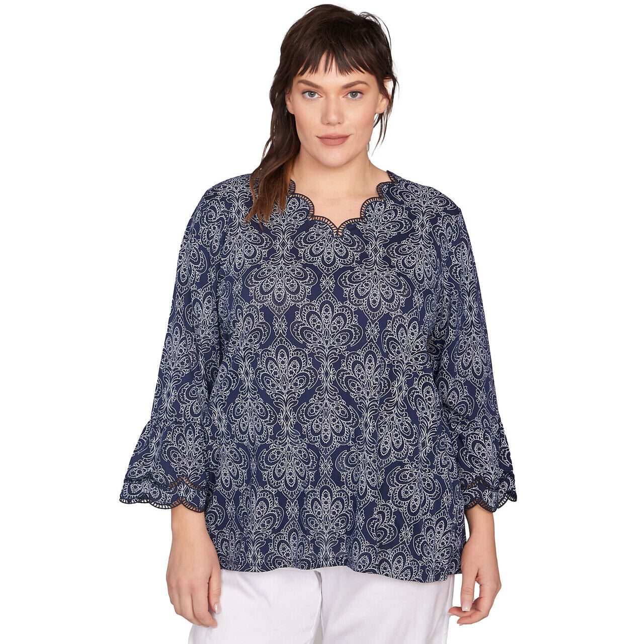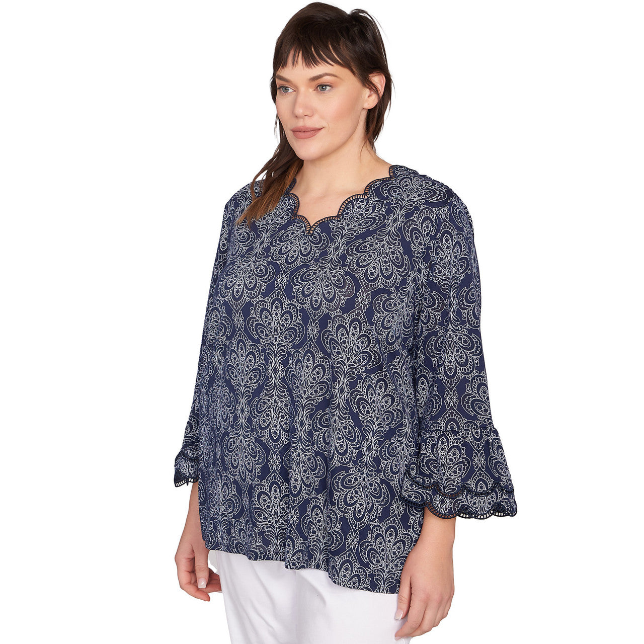 This flowy blouse features a stunning medallion pattern with delicate puff embellishments for a touch of texture and dimension. The scalloped neckline adds a feminine touch, while the 3/4-length bell sleeves create a playful and stylish look. The burnout fabric adds a lightweight and airy feel, making this top perfect for layering or wearing on its own.