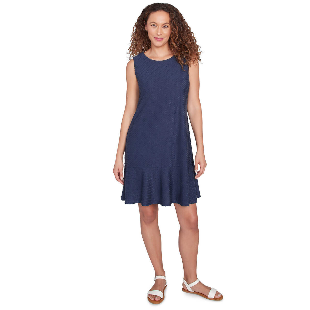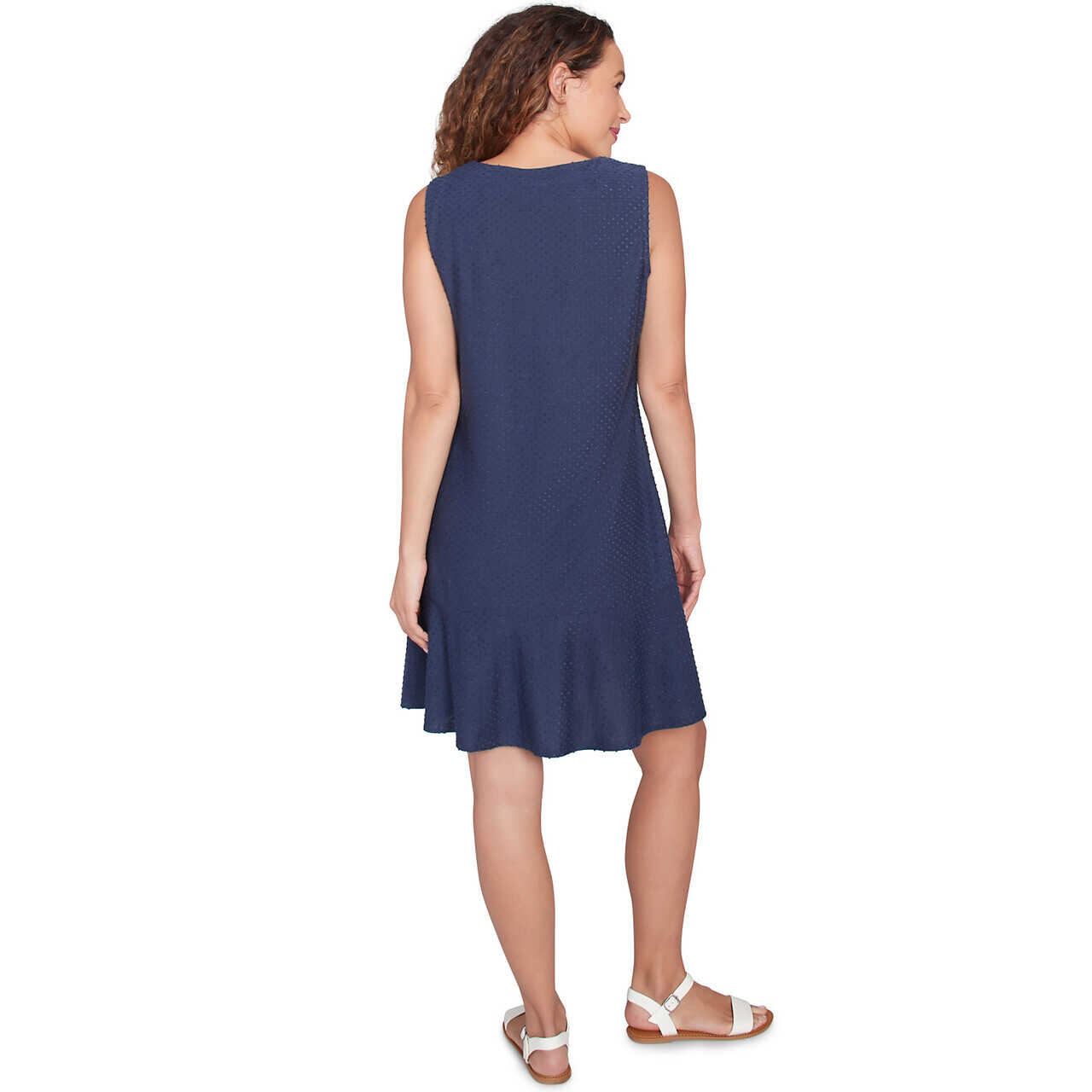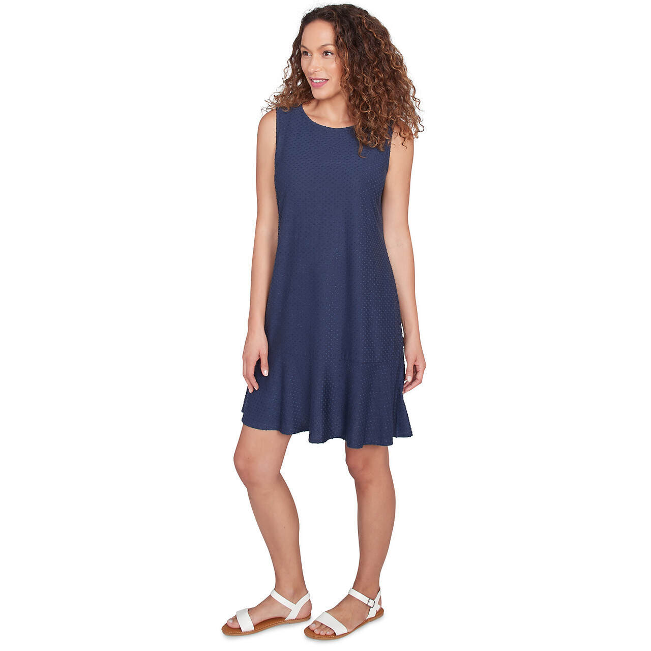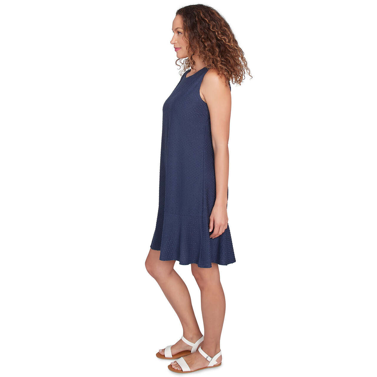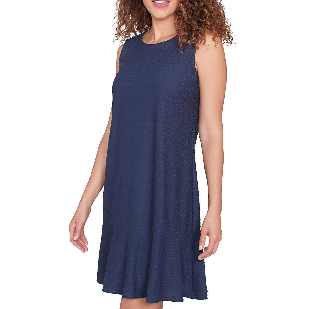 Stay cool and stylish with our Swiss Dot Peplum Dress. The sleeveless design and boat neckline offer a classic look, while the peplum hemline and Swiss dot pattern add a touch of personality. The soft, comfortable fabric ensures all-day comfort.